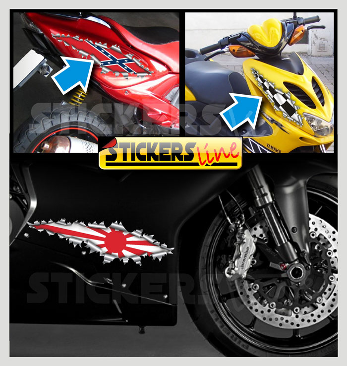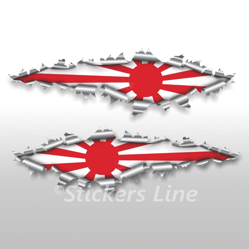 Adesivi dalla grafica fotorealistica, nel disegno è rappresentato un effetto che simula uno strappo di lamiera con all'interno l'immagine della bandiera giapponese, per rendere originale il vostro veicolo.