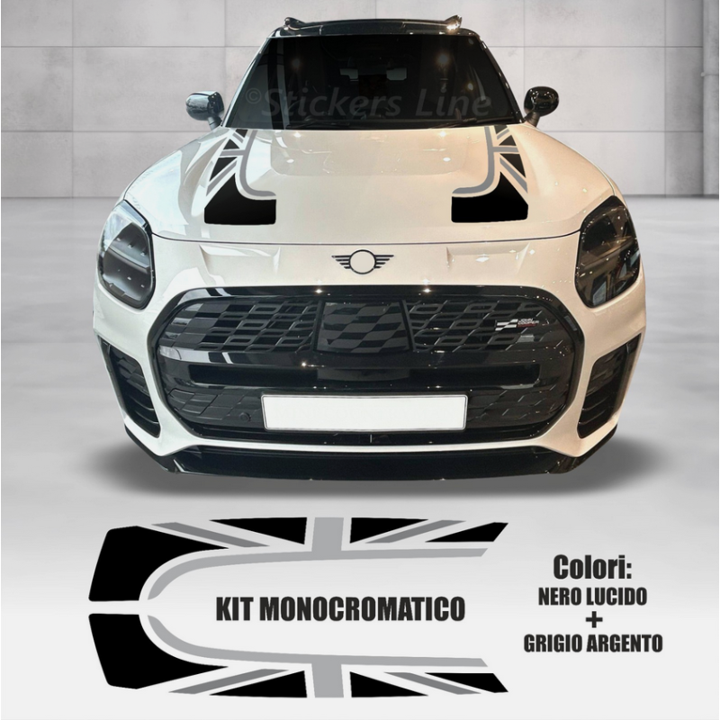 Fasce adesive bandiera inglese monocromatica nero + grigio argento per cofano MINI COUNTRYMAN U25 Cooper S JCW, anno 2024, il materiale utilizzato è una pellicola professionale di ottima qualità, con soli 65 - 70 micron di spessore, studiata per essere applicata sugli automezzi, resistente agli agenti atmosferici come il sole il gelo, i lavaggi, ecc... Gli adesivi sono prodotti con vinile prespaziato senza sfondo trasparente, il kit comprende il necessario per decorare il cofano della vostra Mini.