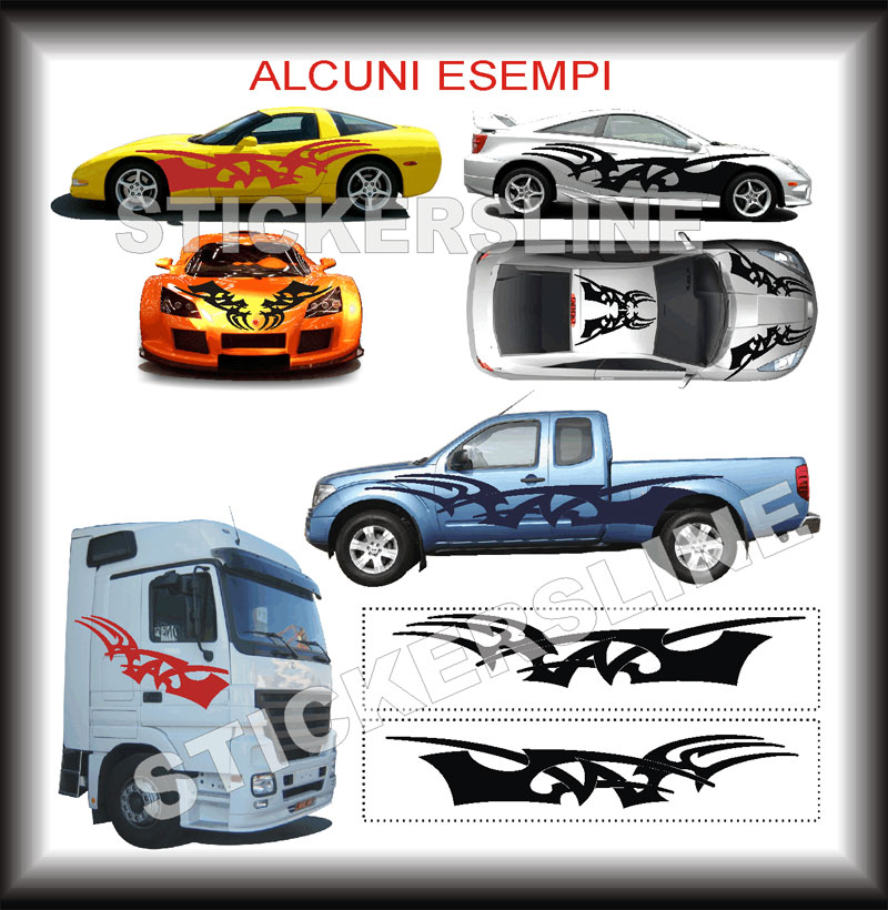 Vendesi accattivante coppia di adesivi (PEZZI 2) modello TRIBAL 6, adatto a tutti i veicoli quali auto, fuoristrada, camion, imbarcazioni, ecc (CONSIGLIATE PER AUTO TUNING). Realizzati in vinile professionale di prima scelta meno di 70 micron... ad alta conformabilità, la linea di questi adesivi vi permetterà di decorare perfettamente la carrozzeria della vostra auto... anche nelle superfici irregolari quali curve e scanalature, concepiti per essere applicati su tutti i tipi di automezzi,anche su fuoristrada, furgoni, camion, veivoli, imbarcazioni...ecc... resistente alle intemperie e ai lavaggi frequenti. STUDIATI PER MIGLIORARE L'ESTETICA DELLA VOSTRA AUTO!!! CONSIGLIATO PER AUTO ELABORATE, DAL LOOK PARTICOLARMENTE SPORTIVO ED AGGRESSIVO...
