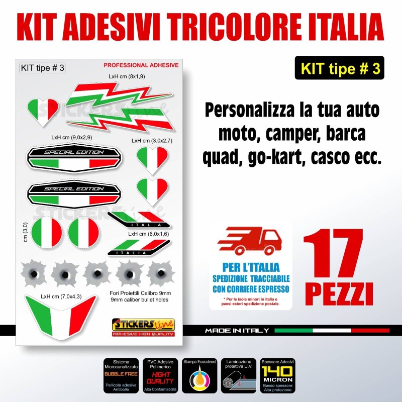 17 adesivi in vinile stampato con colori italia in varie forme e misure, laminati e intagliati, da utilizzarsi per rinnovare il look della tua auto, moto, barca, camper, bici, go-kart, quad, ecc, questi adesivi sono stati realizzati con pellicole professionali antibolle con sistema bubble-free (non si formeranno bolle d'aria sotto gli adesivi durante l'applicazione) stampati con tecnologia ecosolvente con inchiostri molto resistenti e laminati in superficie con filtro UV per una massima resistenza contro gli agenti atmosferici.12CONTATTI: