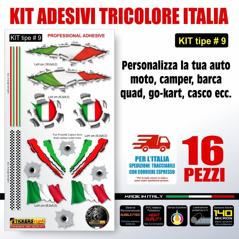 16 adesivi in vinile stampato con colori italia in varie forme e misure, laminati e intagliati, da utilizzarsi per rinnovare il look della tua auto, moto, barca, camper, bici, go-kart, quad, ecc, questi adesivi sono stati realizzati con pellicole professionali antibolle con sistema bubble-free (non si formeranno bolle d'aria sotto gli adesivi durante l'applicazione) stampati con tecnologia ecosolvente con inchiostri molto resistenti e laminati in superficie con filtro UV per una massima resistenza contro gli agenti atmosferici.CONTATTI: