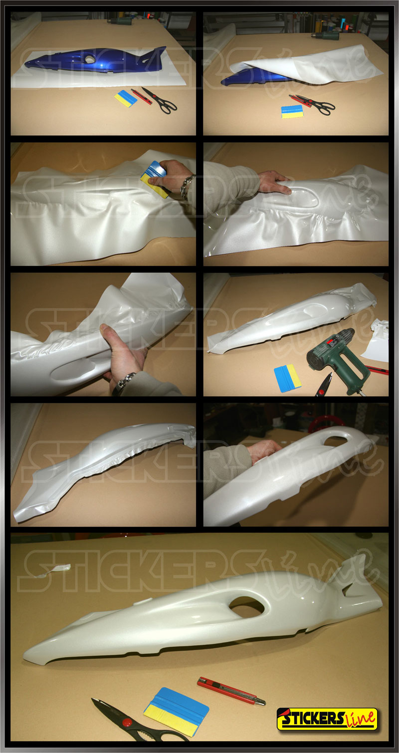 Pellicola di tipo CAST antigraffio, termoformabile, di lunghissima durata, spessore 120 micron. Durante l'applicazione avrete la possibilità di rimuovere l'adesivo per spostarlo o cambiarne la posizione prima di fissarlo definitivamente, osservate (nella foto quì sotto). La parte sottostante della pellicola ha un sistema microcanalizzato chiamato "Air Free FT-System" per permettere all'aria di fuoriuscire da sotto l'adesivo durante la lavorazione senza lasciare bolle, alta resistenza contro gli agenti atmosferici.