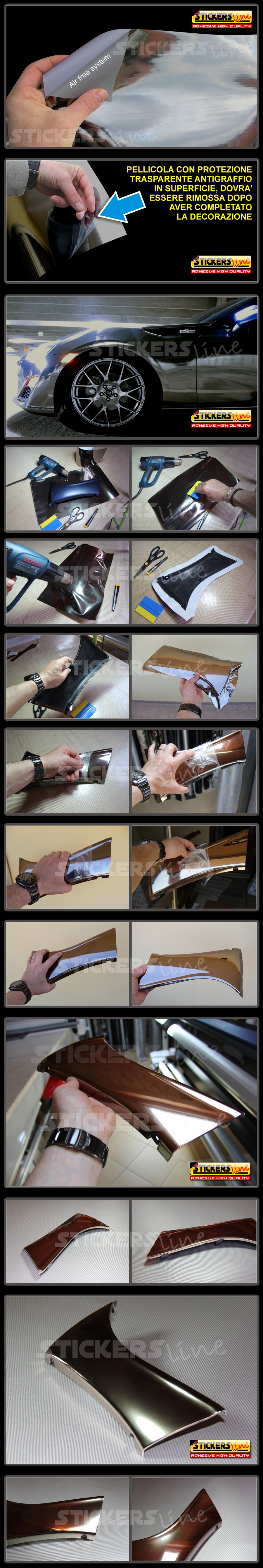Questo prodotto come tante pellicole simili cromate ha uno spessore maggiore rispetto alle comuni pellicole per il car wrapping quindi una rigidità maggiore, per cui si consiglia di utilizzare assolutamente una pistola termica da carrozzeria per applicarla, da utilizzarsi come già sopra descritto su superfici piane curve e moderatamente bombate, nei punti più critici utilizzare il primer per migliorare l'adesione della stessa, l'applicazione richiede inoltre un pò di esperienza.