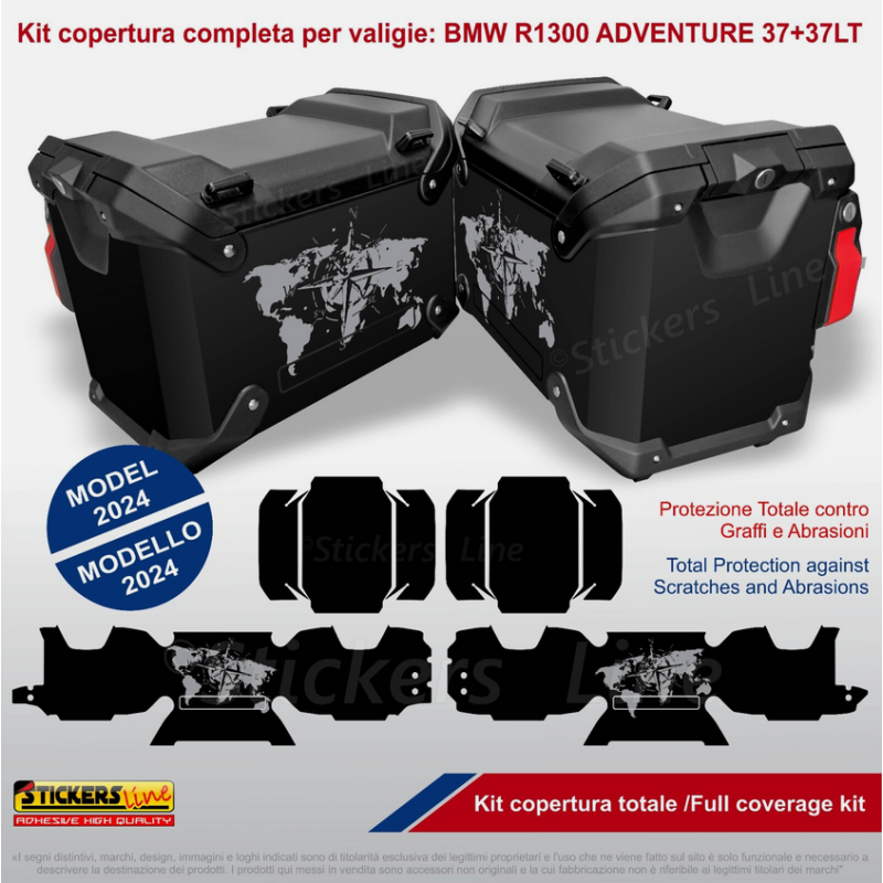 Kit di adesivi completo per proteggere le tue valigie laterali bmw come da foto, con grafica rosa dei venti + planisfero, molto bella e dettagliata, questo kit copre completamente le facciate delle valigie in alluminio, sul coperchio superiore va applicata una speciale copertura nera opaca antigraffio goffrata da 210 micron di spessore per offrire il massimo della resistenza contro le abrasioni. Questo kit è prodotto con pellicole pregiate tra le migliori in commercio che assicurano un adesione perfetta ed un alta resistenza contro intemperie, graffi e abrasioni di vario genere, dove verranno applicati questi adesivi le valigie della tua moto saranno sempre come nuove coprendo quelle brutte ed antiestetiche macchie che si creano solitamente sull'alluminio grezzo e quelle abrasioni che solitamente si creano sulle valigie nere.Il kit che riceverai è facile da montare perché creato su misura per le tue valigie originali, basterà seguire gli incastri già presenti negli adesivi, migliorerai sensibilmente l'estetica della tua moto! Questo kit di adesivi può essere applicato sia sulle valigie colore alluminio e anche sulle valigie nere.