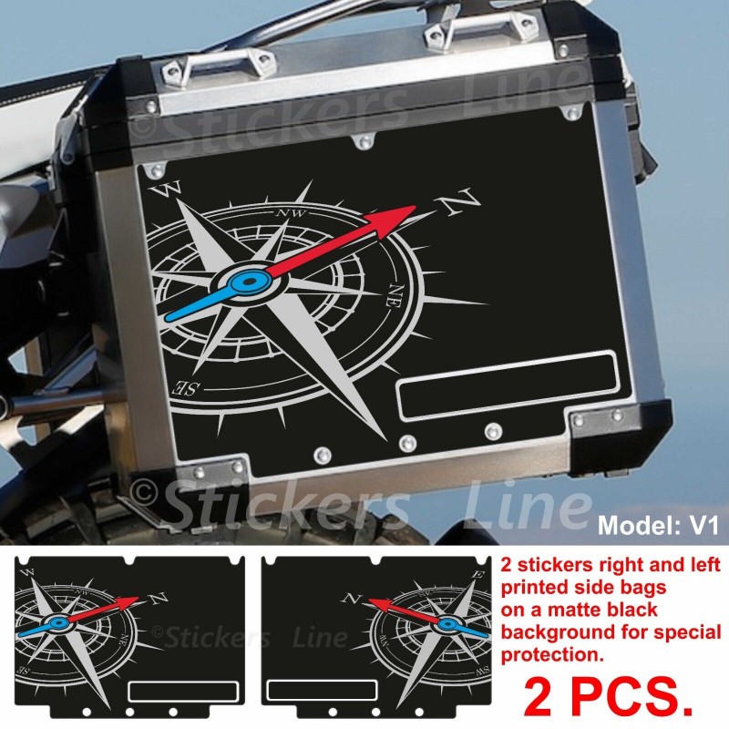 Adesivi stampati e laminati su sagoma con fondo nero opaco, con grafica bussola colore grigio chiaro, questo kit copre completamente la facciata della borsa in alluminio, prodotto con pellicole pregiate tra le migliori in commercio, spessore 140 micron, assicurano un adesione perfetta ed un alta resistenza contro intemperie, graffi e abrasioni di vario genere, dove verranno applicati questi adesivi le borse della tua moto saranno sempre come nuove coprendo quelle brutte ed antiestetiche macchie che si creano solitamente sull'alluminio grezzo! " il kit che riceverai è composto da un adesivo destro ed uno sinistro, facile da montare perchè grandi come la facciata della borsa, basterà seguire gli incastri già presenti negli adesivi, migliorando sensibilmente l'estetica della tua moto!