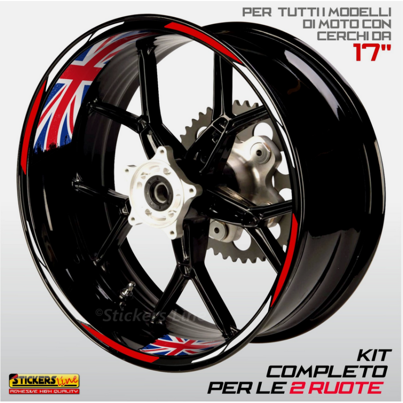 Adesivi strisce cerchi BIANCO ROSSO + bandiera inglese per ruote moto triumph