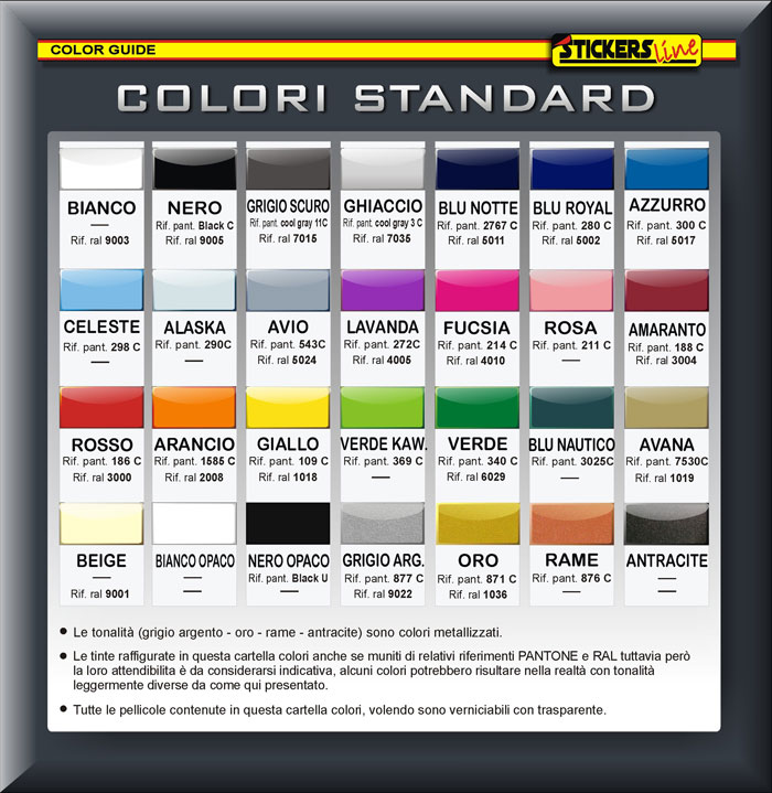 Il prezzo del kit indicato in questa inserzione è riferito agli adesivi con COLORI STANDARD (quì sopra riportati) se desideri il kit con uno dei COLORI SPECIALI (riportati quì sotto) contattaci prima, inseriremo per te un inserzione con il costo corrispondente al colore speciale che hai scelto, perchè le tinte speciali hanno un costo superiore rispetto alle colorazioni standard, i sovraccosti sono indicati con degli asterischi in fondo al pantone.