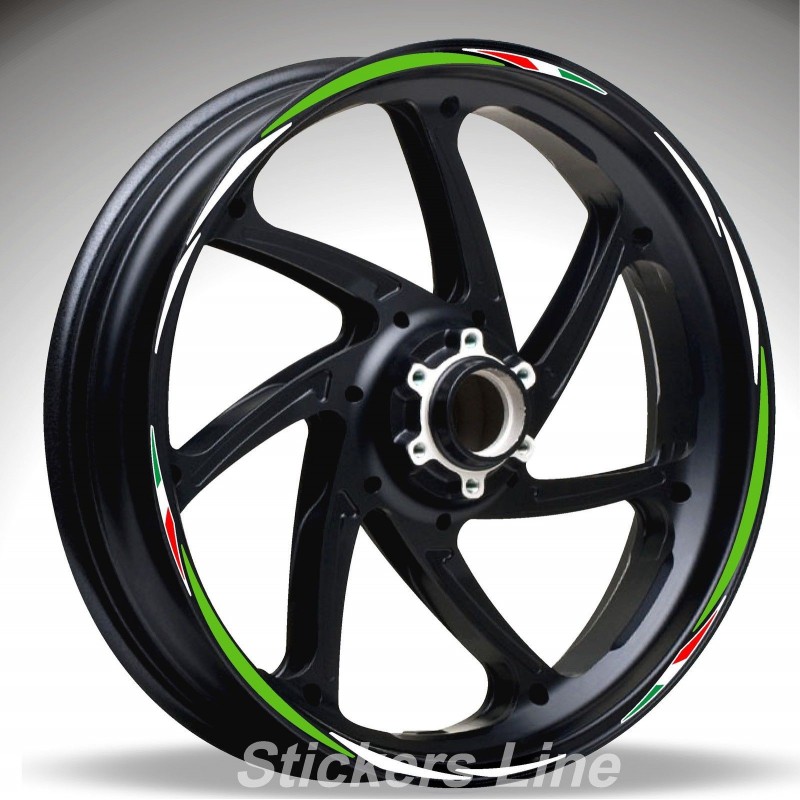 Rendi la tua moto ancora più accattivante!!! Kit di strisce universali per tutte le moto aventi cerchi da 17 pollici, versione RACING 4+ bandierine ITALIA, un nuovo design ideato per moto davvero aggressive, formato da due colori a scelta tra le tinte disponibili (leggi sotto). Questi adesivi sono già curvati di facile applicazione e veloci da montare senza dover smontare necessariamente le ruote, per un risultato garantito, MIGLIORANDO SENSIBILMENTE L'ESTETICA DELLA TUA MOTO...