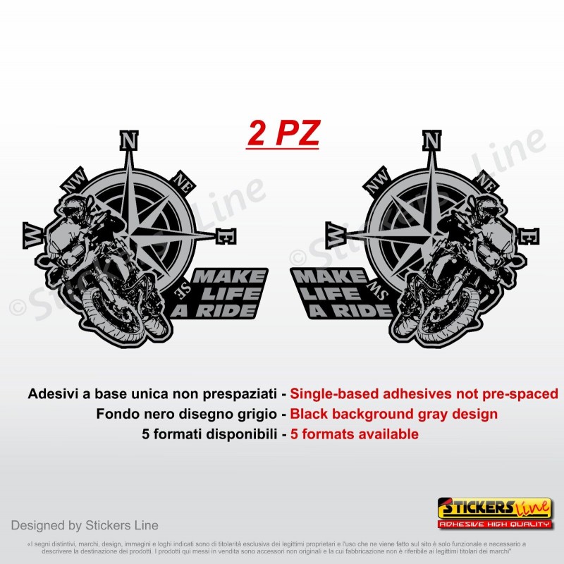 Adesivi con grafica moto Bmw GS + bussola stampati in grigio su sfondo nero, finitura opaca.