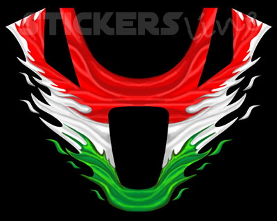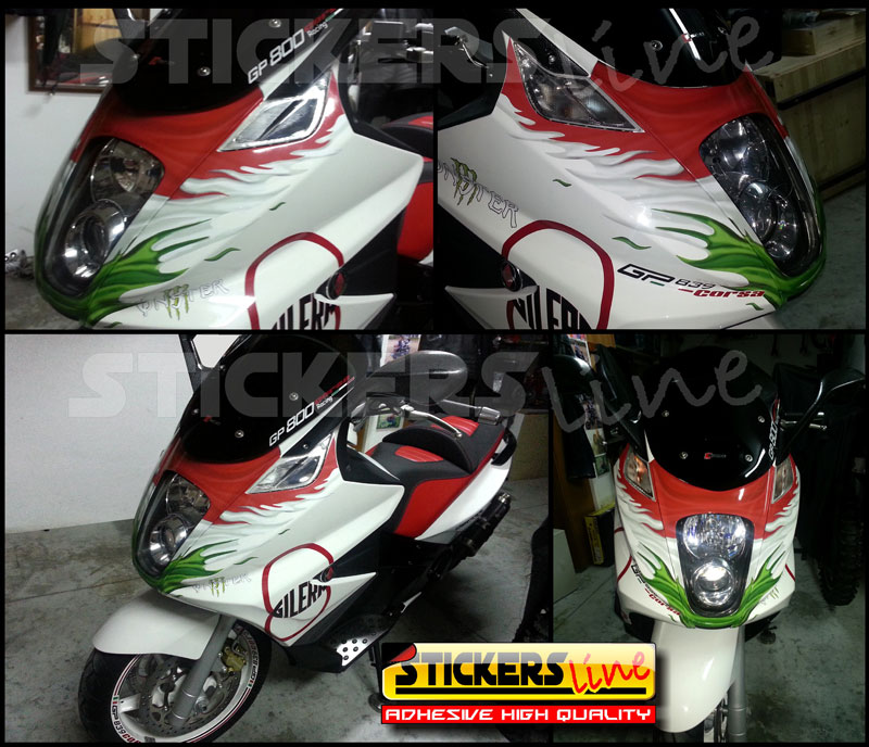 Adesivo tricolore italiano, per scudo anteriore gp 800, articolo molto raffinato sembra areografato, grazie alle sfumature e al fatto che l'adesivo è completamente fustellato esternamente, una volta applicato darà un look molto aggressivo al tuo scooter, migliorandone l'estetica.