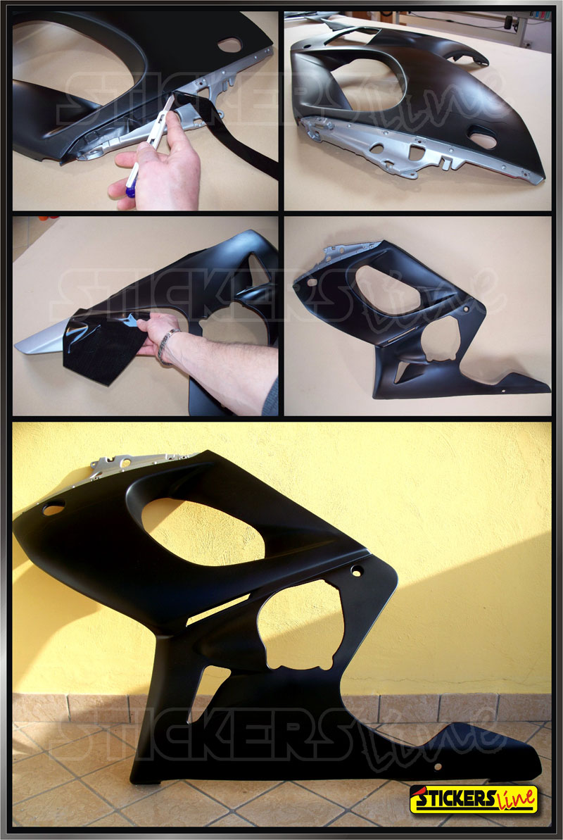 Pellicola di tipo CAST antigraffio, termoformabile, di lunghissima durata, spessore 110 micron. Durante l'applicazione avrete la possibilità di rimuovere l'adesivo per spostarlo o cambiarne la posizione prima di fissarlo definitivamente, osservate (nella foto quì sotto). La parte sottostante della pellicola ha un sistema microcanalizzato chiamato "Air Free FT-System" per permettere all'aria di fuoriuscire da sotto l'adesivo durante la lavorazione senza lasciare bolle, alta resistenza contro gli agenti atmosferici.